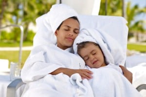 Woman and daughter (2-3) wrapped in towels at spa, sleeping on chair outdoors
