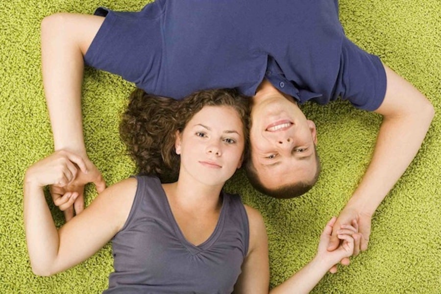 young couple lying on the green carpet