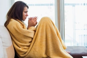 Side view of sick woman having coffee on sofa in living room
