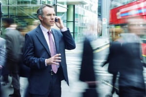 Businessman Using a Mobile Phone with Blurred People in the Background